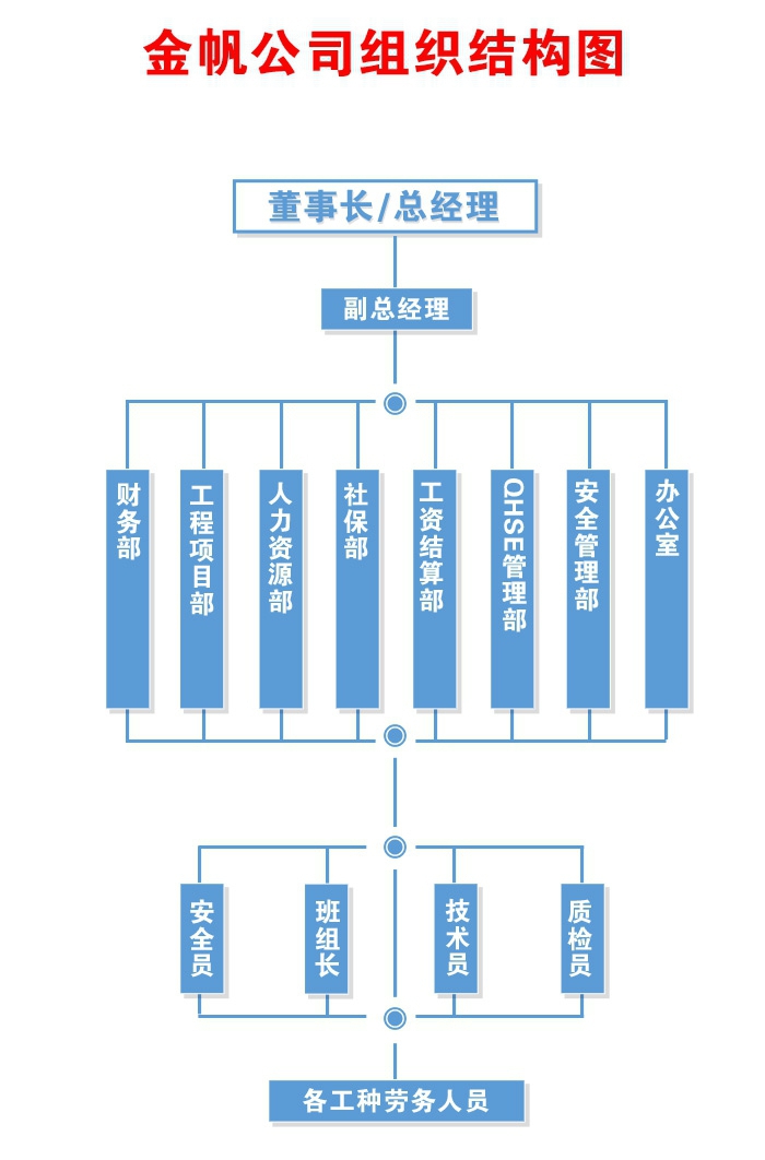 公司下設(shè)總經(jīng)理辦公室、工程項(xiàng)目部、生產(chǎn)經(jīng)營(yíng)部、安全監(jiān)督部、QHSE管理部、技術(shù)部、設(shè)備部、材料部、財(cái)務(wù)部、人力資源部、社保部、客戶服務(wù)部等管理。公司以現(xiàn)代化的科學(xué)管理手段推行先進(jìn)施工技術(shù),建立完善的質(zhì)量、安全環(huán)保體系,以服務(wù)態(tài)度、服務(wù)形象贏得了良好的經(jīng)濟(jì)效益和社會(huì)信譽(yù)。兩年來先后與世界五百強(qiáng)企業(yè)----瀘州市臨江油氣田服務(wù)公司(中石油下屬企業(yè))、中石化西南石油局物探大隊(duì)241隊(duì)(中石化下屬企業(yè))、中石化西南石油局物探大隊(duì)249隊(duì)(中石化下屬企業(yè))、中石化石油工程地球物理有限公司西南分公司(中石化下屬企業(yè))、中石化西南石油局貴州服務(wù)中心(中石化下屬企業(yè))、中石化西南石油局赤水天然氣銷售公司(中石化下屬企業(yè))、中國(guó)移動(dòng)通信集團(tuán)四川有限公司瀘州分公司;瀘州市第七建筑工程公司、瀘州太昌建筑安裝工程有限公司、四川省佳訊通信工程有限公司、四川瀘州市世紀(jì)建筑工程有限公司等單位建立勞務(wù)分包合作關(guān)系。