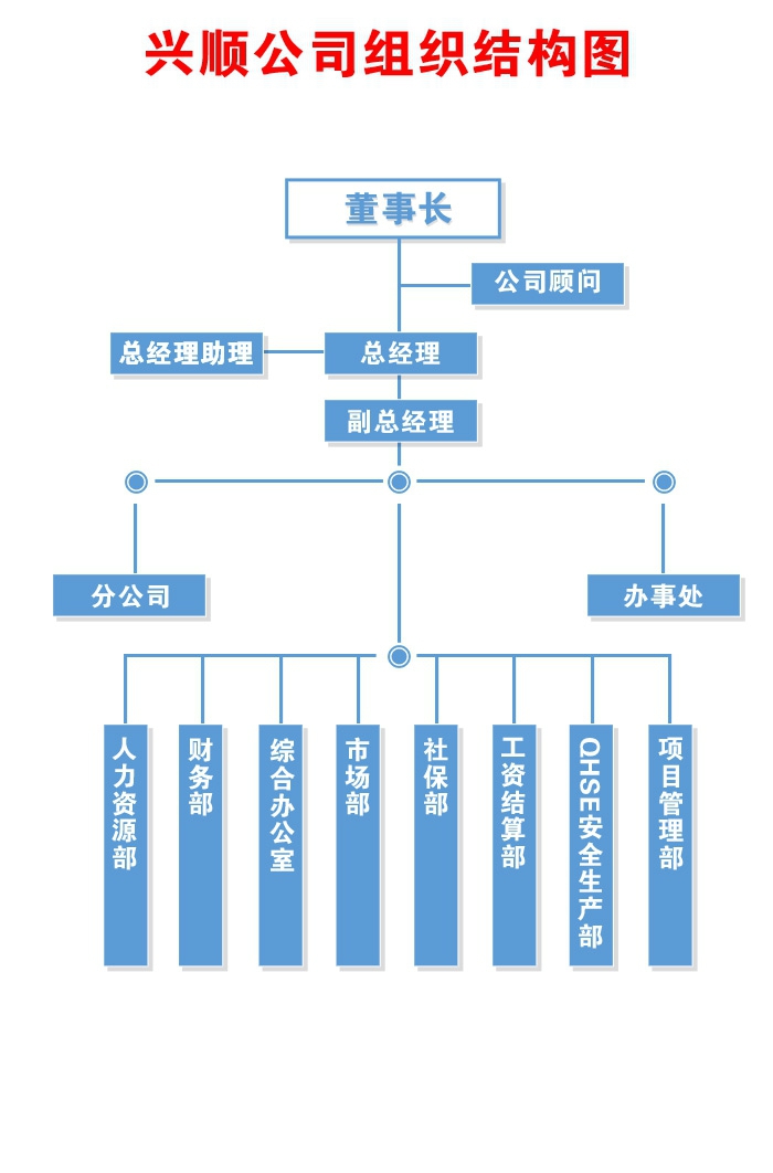 公司下設(shè)有:四川興順勞務(wù)代理有限公司成都分公司、四川興順勞務(wù)代理有限公司物業(yè)服務(wù)分公司、敘永辦事處、貴陽(yáng)辦事處、云南辦事處、廣西辦事處、德陽(yáng)辦事處、百色辦事處、赤水辦事處、川中公管中心南充辦事處;四川金帆建筑勞務(wù)有限公司各工程項(xiàng)目部。公司內(nèi)設(shè)有:公司辦公室、財(cái)務(wù)部、人力資源部、市場(chǎng)部、外包業(yè)務(wù)管理部、QHSE安全生產(chǎn)部、工資及社會(huì)保險(xiǎn)管理部、顧問(wèn)辦公室等職能部門。